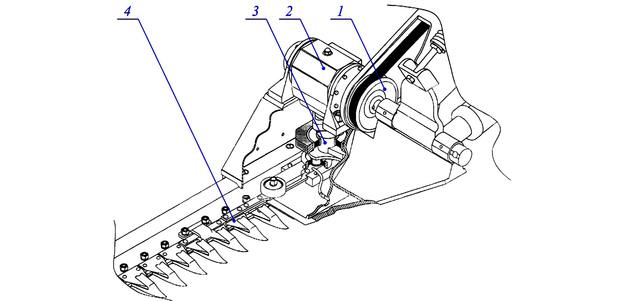 Fig. 1. General view of the crank-slider drive mechanism of the segment-finger cutting apparatus of the mounted mower: 1 — driven pulley; 2 — a bevel reduction gear; 3 — the crank-slider mechanism; 4 — the cutting apparatus.