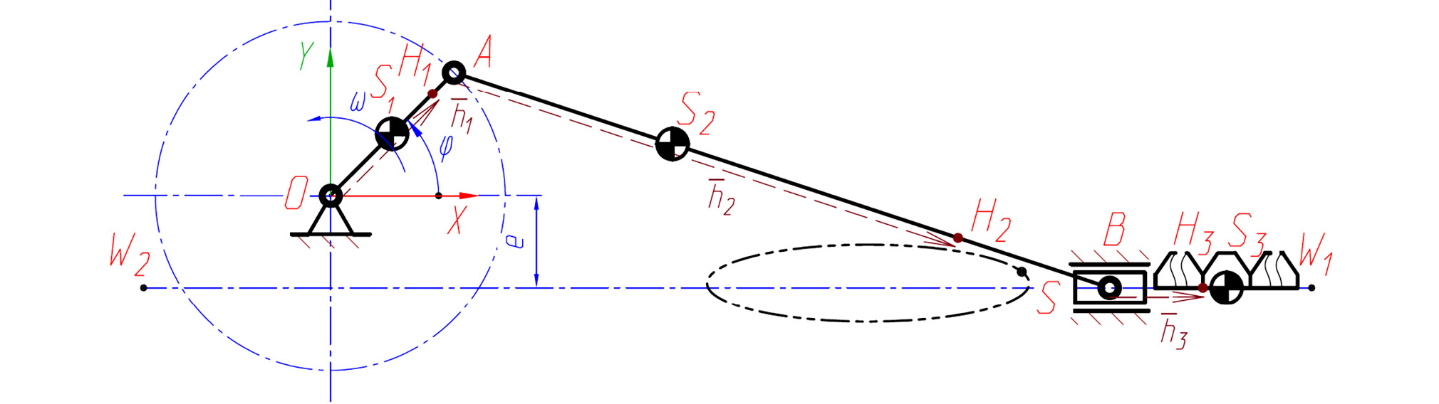 На рис. 2 приведена кинематическая схема дезаксиального КПМ привода РА навесной косилки. Согласно приведенной схеме, вращение кривошипа OA осуществляется с заданной угловой скоростью ω вокруг т. О неподвижного шарнира. При вращении кривошипа, расположенный в т. B ползун совершает возвратно-поступательное движение вдоль оси направляющей W1W2 (расположенной с отрицательным дезаксиалом e относительно т. О), в результате чего происходит срез растительной массы ножом РА. При движении механизма общий центр масс (ЦМ) неуравновешенного КПМ привода РА, расположенный в т. S, совершает движение по некоторой замкнутой траектории с переменным вектором ускорения.