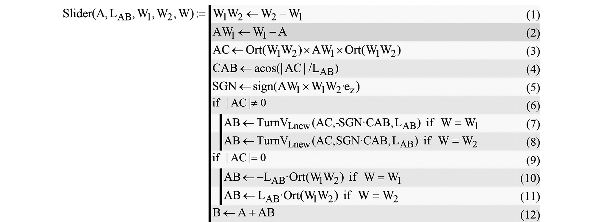 В строке (1), приведенной на рис. 3 функции пользователя, находится относительный вектор оси направляющей движения ползуна как разность между известными абсолютными векторами координат точек его оси W2 и W1. В строке (2) определяется вспомогательный относительный вектор в виде разности между абсолютными векторами точки W1 и точки A начала шатуна (окончания кривошипа). Используя свойство двойного векторного произведения [12], которое заключается в разложении известного вектора на две компоненты, одна из которых будет параллельна, а вторая перпендикулярна заданному вектору, в сроке (3) находится относительный вектор вспомогательного звена AC, перпендикулярный оси направляющий движения ползуна (см. рис. 4). В строке (4), с помощью обратной тригонометрической функции, находится вспомогательный угол CAB.