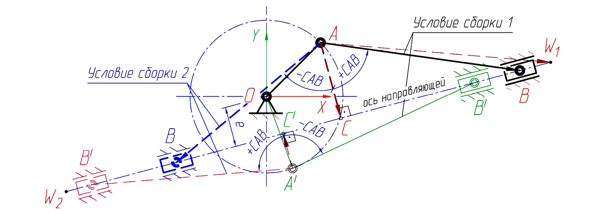 Выбор одного из двух условий сборки КПМ интуитивно понятен: к какой из двух точек оси направляющий движения (W1 или W2) должен быть ближе всего расположен ползун в крайних положениях, та точка и должна быть задана в качестве входного параметра оператора W в функции пользователя (см. рис. 3). В последней строке (12) определяется искомый абсолютный вектор точки B ползуна КПМ как сумма абсолютного вектора точки A и найденного относительного вектора звена AB для принятого условия сборки механизма.
