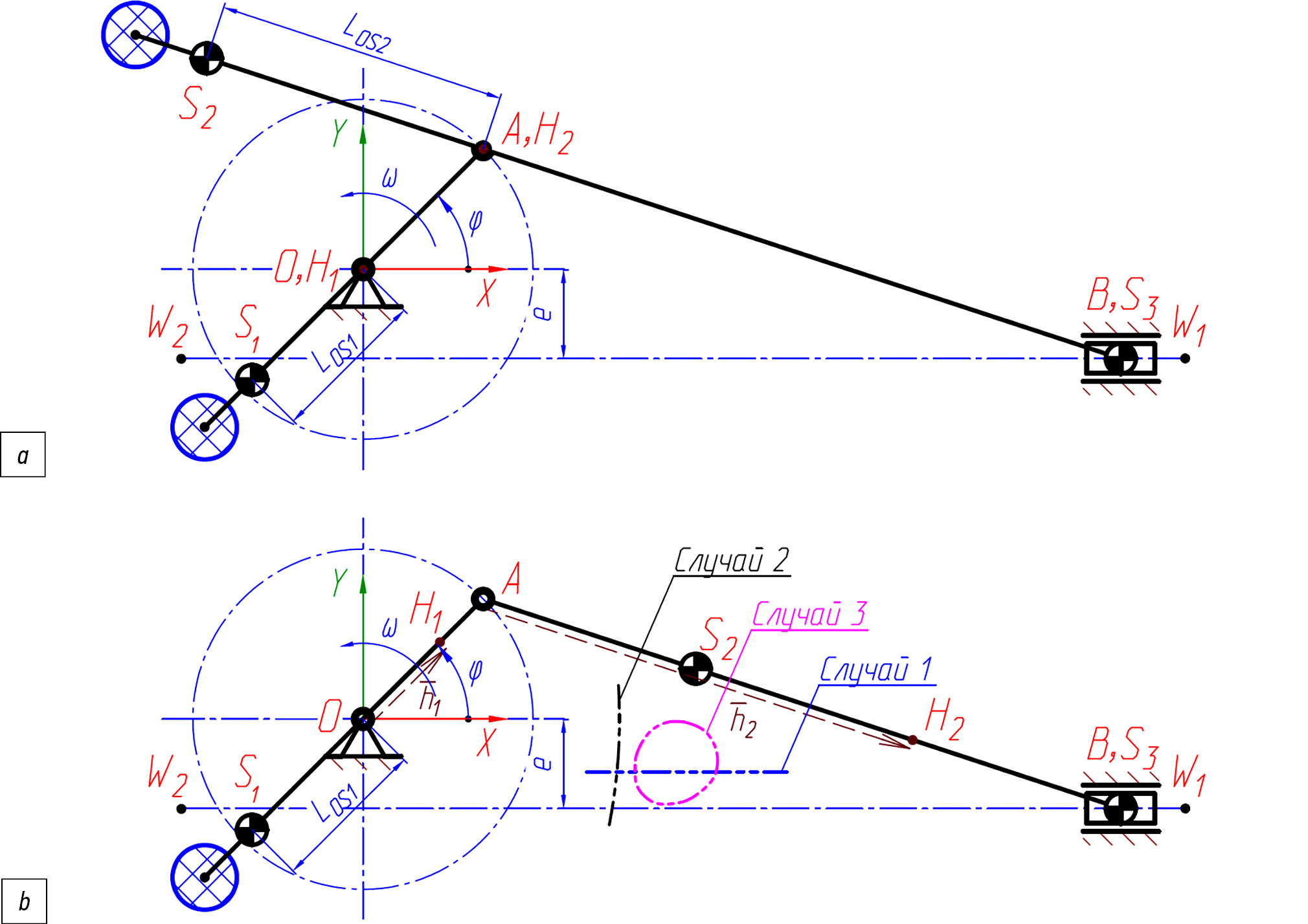 Согласно кинематической схеме, приведенной на рис. 2, положение всех характерных точек КПМ привода РА определяется положением входного звена — кривошипа OA, которое в свою очередь однозначно определяется углом ϕ поворота кривошипа к горизонтальной оси X принятой системы координат. Данный угол принят в качестве обобщенной координаты при аналитическом описании кинематики КПМ, а в качестве исходных данных выступают длины звеньев (LOA и LAB), привязка ЦМ звеньев по соответствующим длинам (LOS1, LAS2 и LBS3), координаты неподвижных точек O (шарнира вращения кривошипа), W1 и W2 (точки, определяющие положение оси направляющей движения ползуна).