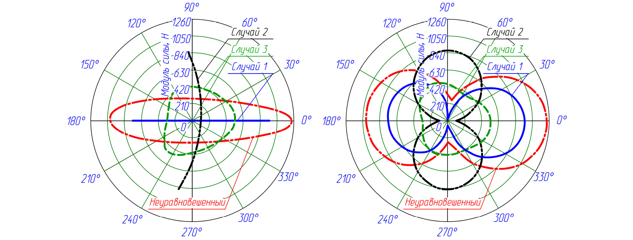 Рис. 6. Изменение модуля неуравновешенного главного вектора сил инерции для рассмотренных случаев уравновешивания: a — в зависимости от угла наклона вектора неуравновешенных сил инерции к горизонтальной оси; b — в зависимости от угла поворота кривошипа.