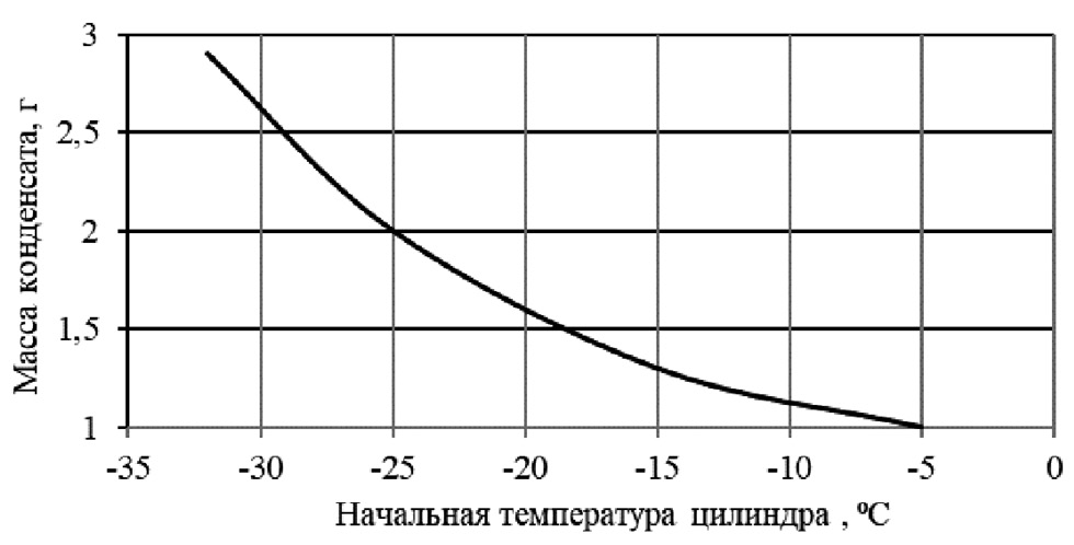 The mathematical model implementation in relation to the KamAZ-740.30 engine with a working volume of 10.9 L at −32 °C enabled determination of the estimated amount of water by changing the state of aggregation, which amounted to 2.9 g.