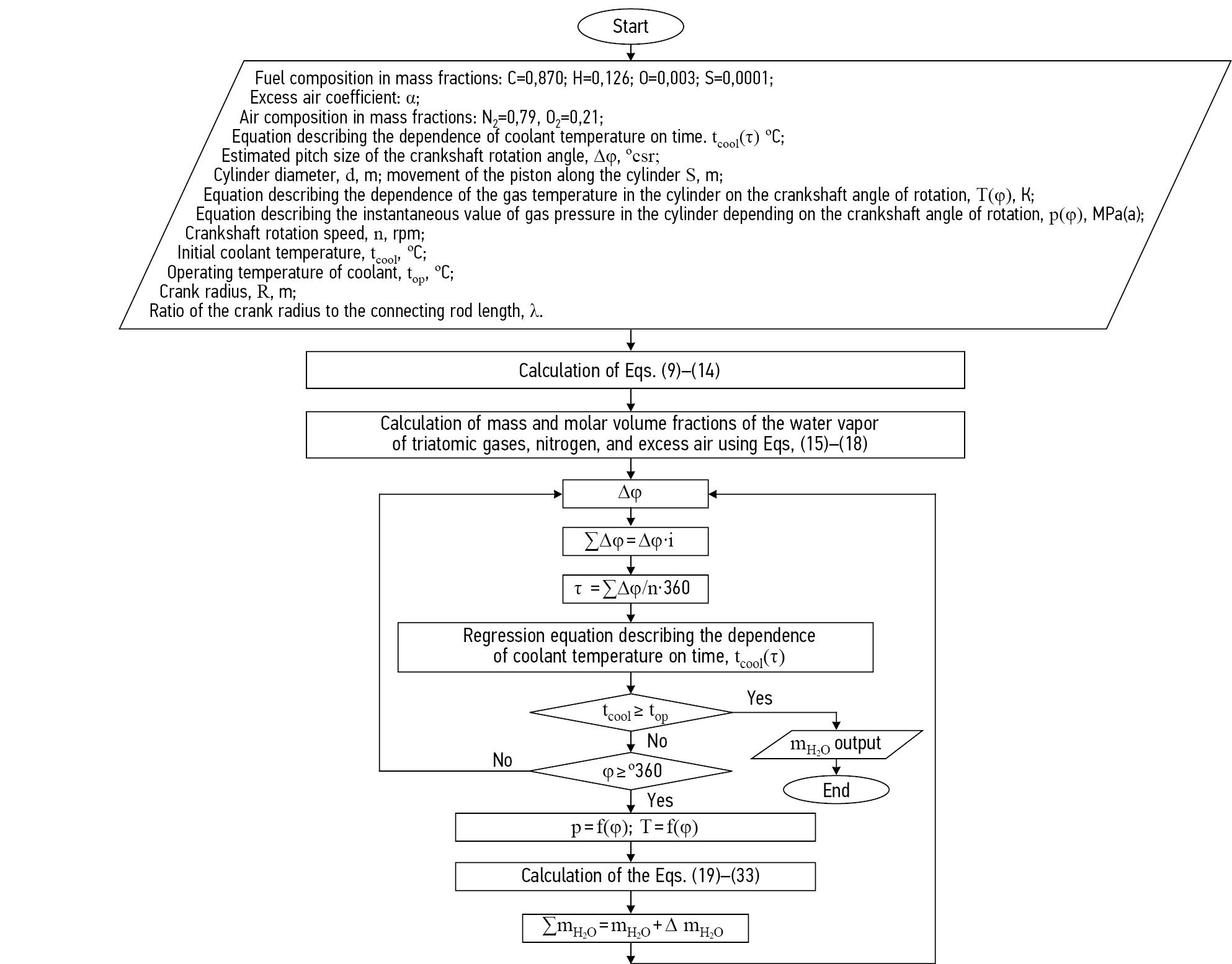 These processes can occur in engine mechanisms and systems. The areas of condensation processes must be systematized. Primary areas include spaces where water is directly formed by the oxidation of fuel hydrogen atoms, namely, the combustion chamber and the inner surface of the cylinder sleeve. Secondary areas include internal surfaces of parts and assembly units that provide gas removal. Finally, the surfaces in the crankcase volume represent area 3 of such processes [3]. The mass formation of water is difficult to calculate, requiring a systematic approach considering many factors influencing the activity of processes. According to the presented system of areas, a mathematical model must be developed that describes condensation processes in the engine cylinder, namely, a mathematical model that provides a promising solution to the problem of determining the amount of water condensing in the cylinder during the warmup period. This model is created according to such factors as significant differences in temperature and pressure, the turbulization of gases, changes in piston velocity, and the activity of heat exchange processes.
