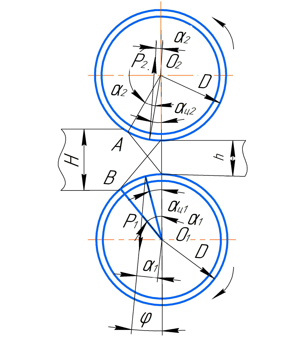 где H — первоначальная высота слоя; h — высота слоя перед вальцами в сечении, соответствующем месту захвата.
