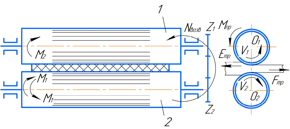 Таким образом, между вальцами существует двойная энергетическая связь: с зубчатой передачей и с самим прокатываемым материалом, находящимся между вальцами. В первой — ведущим всегда является валец 1, а во второй — может быть как валец 1, так и валец 2 в случае проскальзывания вальца 1. При этом вся полезная работа совершается только нижним вальцом, и зубчатая передача оказывается нагружена двойным, против обычного, моментом.