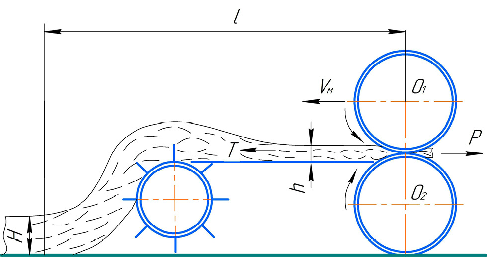 Вследствие большой скорости вальцов материал, лежащий перед ними, подвергается деформации растяжения на некотором участке длиной слой, движущийся со скоростью , проходит этот участок за время t (). За то же время через вальцы пройдет слой материала большей длины (но с меньшей высотой) со скоростью , равной окружной скорости вальцов . Для данных величин справедливо следующее соотношение: