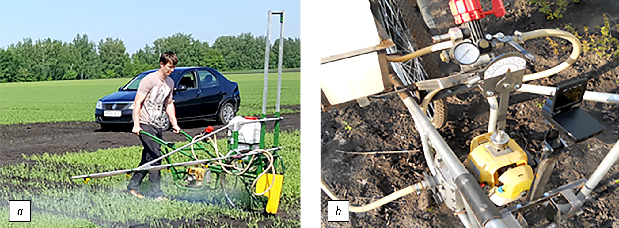Single-support small-sized barrow-type boom sprayers are commonly utilized in several processes, including plant selection, primary seed production, gardening, park farming, and other practices on individual plots. Equipment from Wintersteiger (Austria), Euro Pulve (France), and Walkover International (England) and a sprayer produced by GSKB (Zernoochistka) Voronezh (Russia) are among the most renowned models offered by manufacturers. Single-support sprayers offer several advantages over single-axle two-wheeled designs: they consume less metal, are more maneuverable, do not require track reconfiguration, and can be easily moved along narrow paths when switching row spacing. However, they are less stable in the transverse–vertical plane, requiring constant monitoring of the horizontal position of the boom and placing excessive stress on the operator.