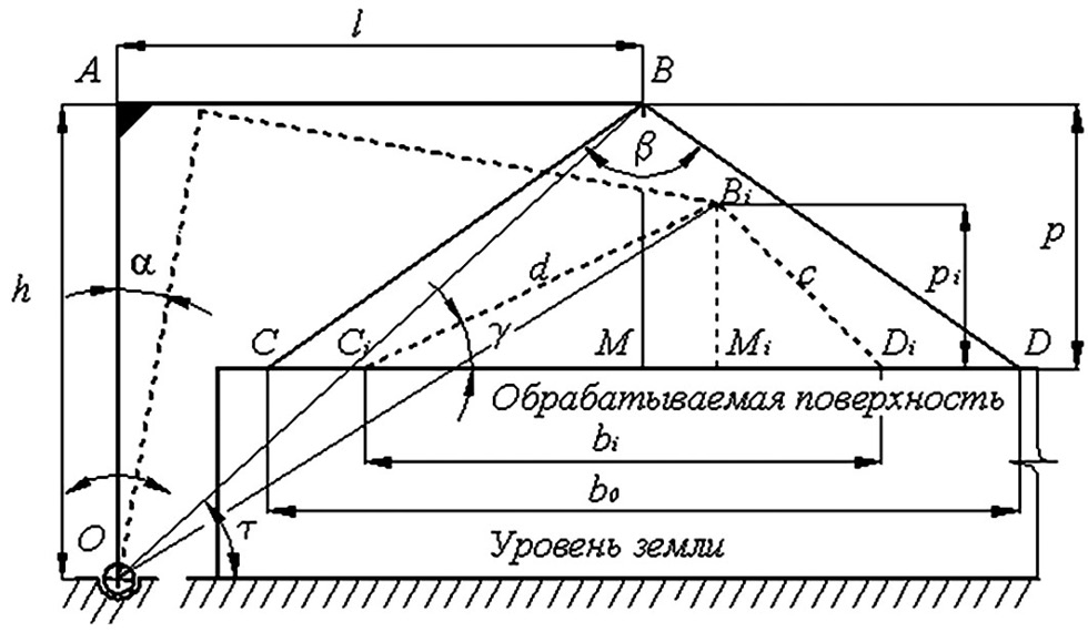 Considering the possibility of the sprayer deflection only in the plane of the drawing, the frame OA, with height h, undergoes transverse movements by an angle α relative to the hinge O. A horizontal boom AB of length l is installed perpendicular to the frame OA and is rigidly connected to it.