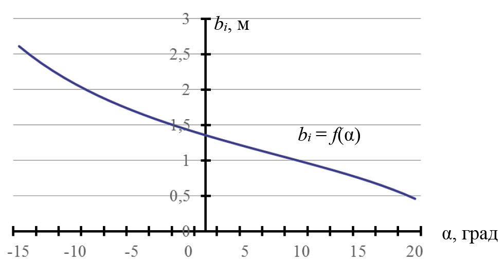 Рис. 4. Зависимость ширины полосы обработки одним распылителем от отклонения опрыскивателя в поперечно-вертикальной плоскости.