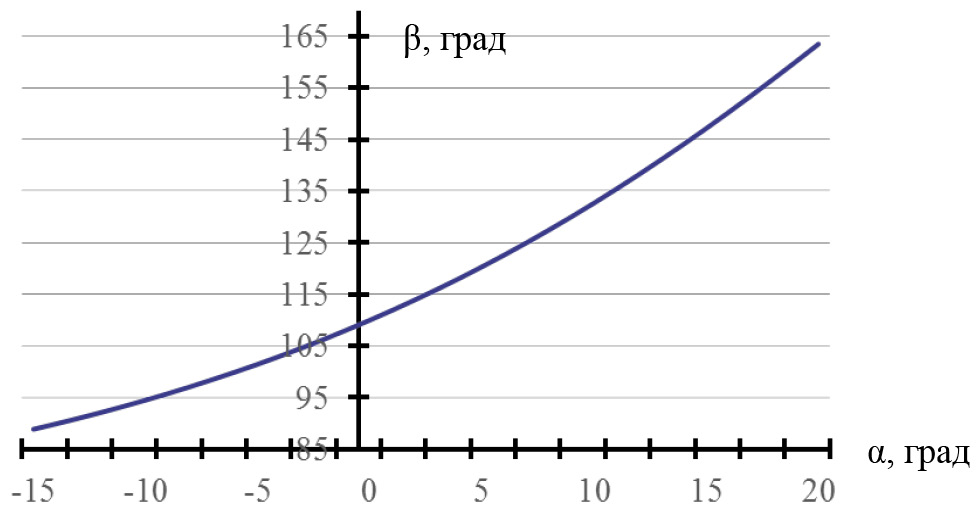 Рис. 5. Зависимость значений требуемого угла распыла адаптивного распылителя от угла наклона одноопорного опрыскивателя в поперечно-вертикальной плоскости.