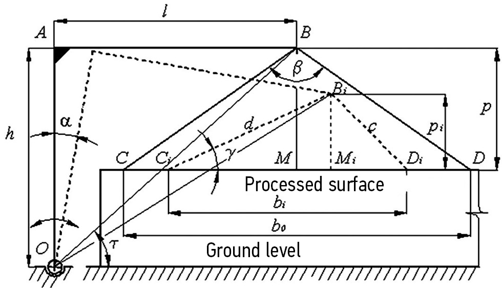 where bi, d and c represent the sides of the scalene triangle СiBiDi, formed by the spray pattern and the surface being processed when the sprayer frame is deflected at a certain angle α.