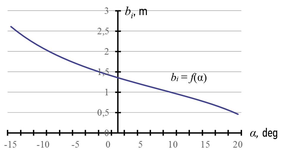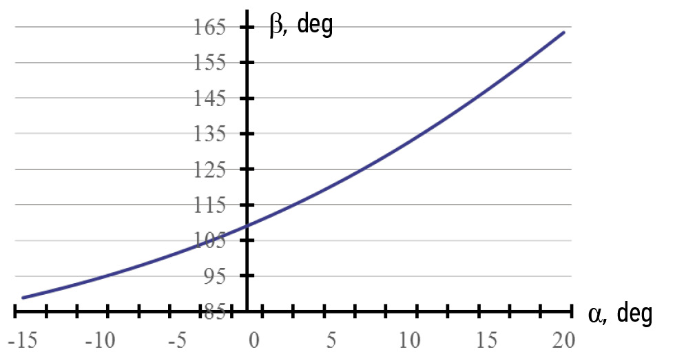 For the numerical values provided in Eq. (15) and the given value of b0 as 1,43 m, a graphical representation of the dependence β = f(α) is presented in Fig. 5. With a strictly vertical position of the sprayer (α = 0°; the horizontal position of the field boom), the root spray angle β = 110° allows for a processing strip with a design width of 1.43 m. When the sprayer is tilted to the left, to the value α = -15°, the distance from the spray nozzle to the surface being treated increases and, consequently, the width of the processing strip increases (Fig. 3). As illustrated in the graph in Fig. 5, to maintain the same working width b0, the required spray angle βi should be equal to 89°. Therefore, the sprayer inclination angle α of 20° determines the opening of the spray pattern angle to β = 164°.