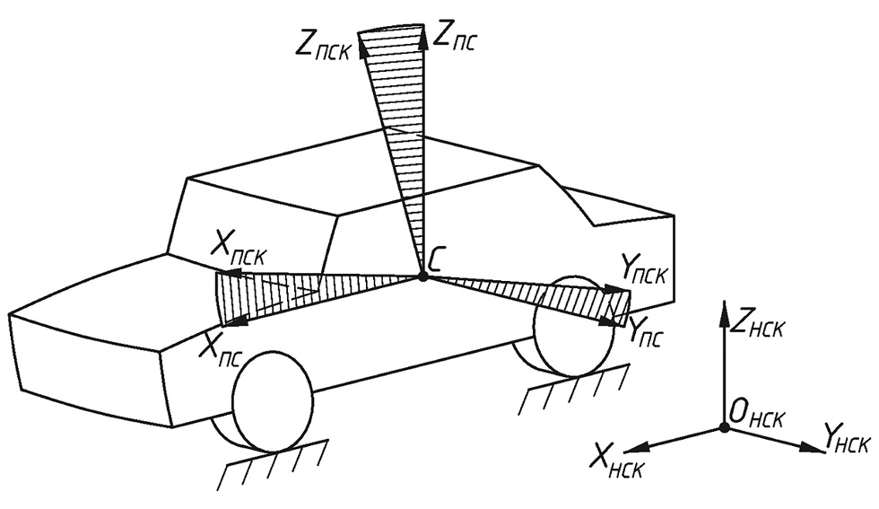 Сначала составляется система уравнений корпуса автомобиля. При составлении системы уравнений рассматривается движение твердого тела в пространстве. В разрабатываемой модели используются три системы координат (рис. 1): неподвижная система координат (НСК, ОНСКXНСКYНСКZНСК), полусвязанная система координат (ПС, CXПСYПСZПС) и подвижная система координат (ПСК, CXПСКYПСКZПСК) [8].