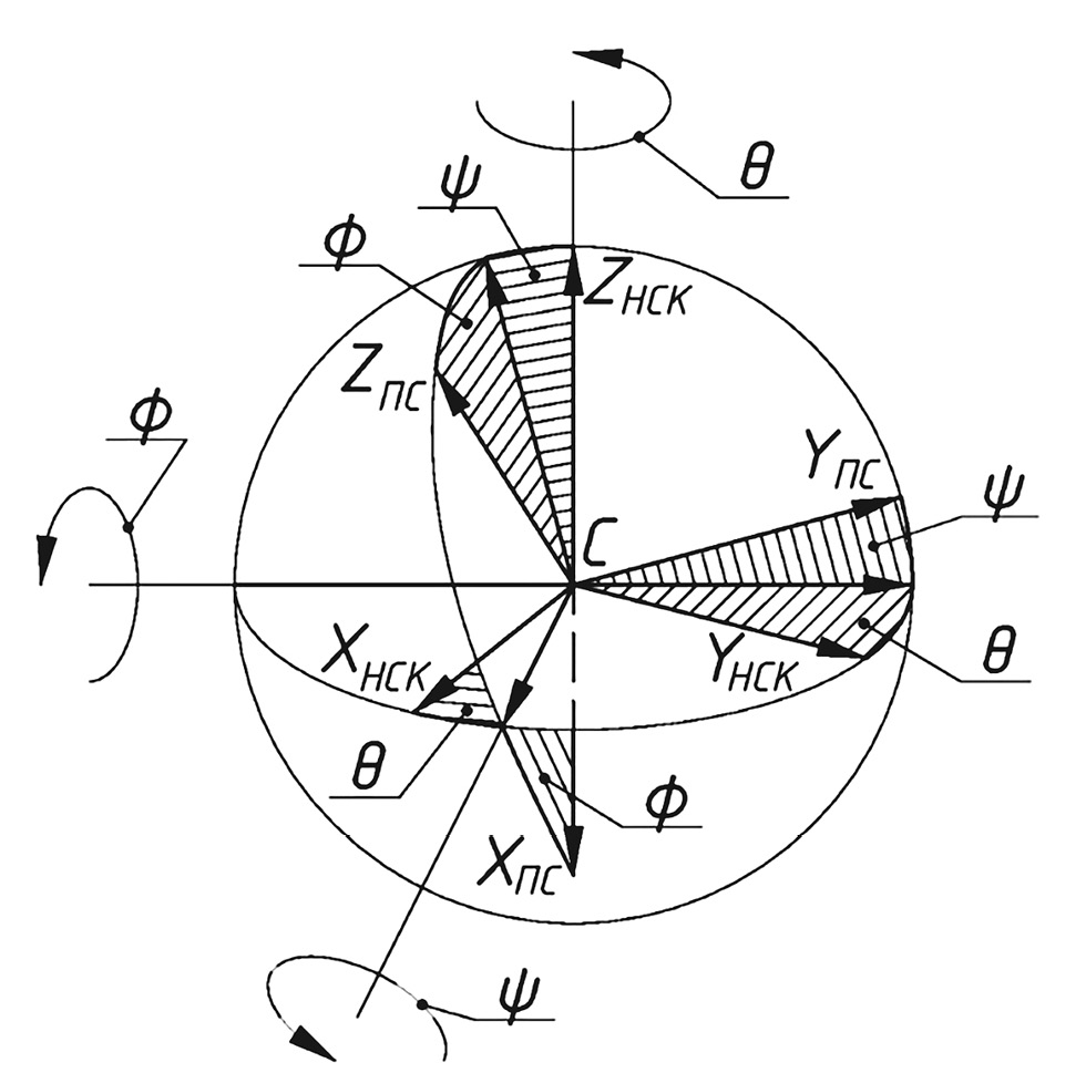 Взаимосвязь между положением корпуса автомобиля в пространстве и неподвижной системой координат характеризуется углами Эйлера–Крылова (рис. 2), углом рыскания (θ), углом дифферента (φ), углом крена (ψ) [1–4, 8]: