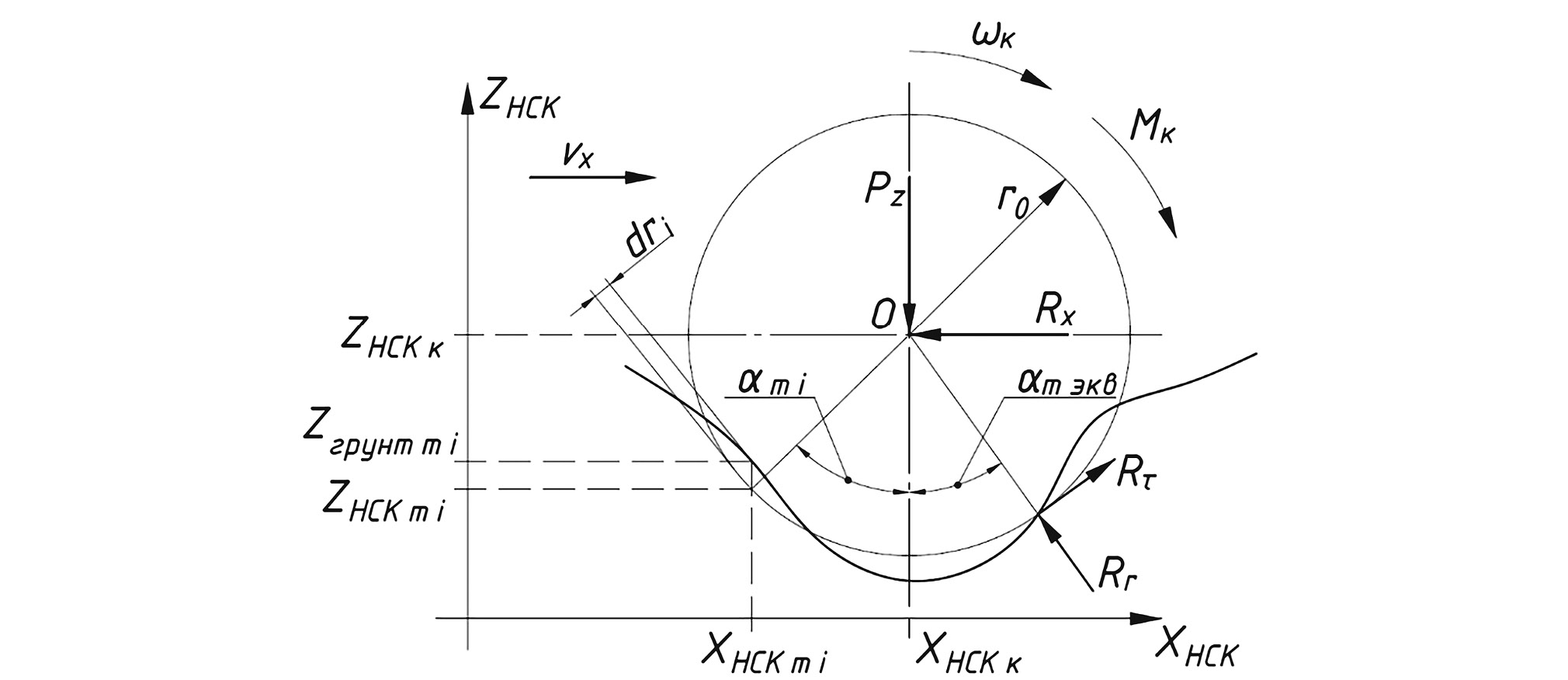 При моделировании взаимодействия колеса следует принять следующее предположение: опорное снование неровное и недеформируемое; трение шины об опорное основание стабильно [1, 7–9]. Для построения расчётной схемы качения колеса (рис. 3 и 4), необходимо ввести микроподвижную систему координат (МпСК), в которой происходит взаимодействие колеса с опорным основанием (рис. 4).