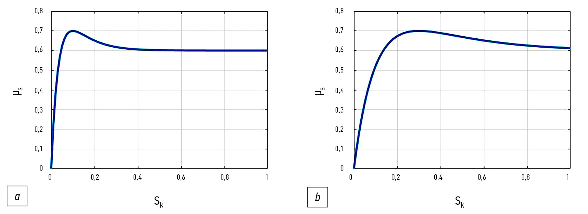 Рис. 5. Графики функции µs(sк) при различных значениях µsα.max и s0 для связных грунтов: а) µsα.max= 0,6; s0 = 0,0458; s1 = 0,0864; b) µsα.max = 0,6; s0 = 0,1373; s1 = 0,2539.