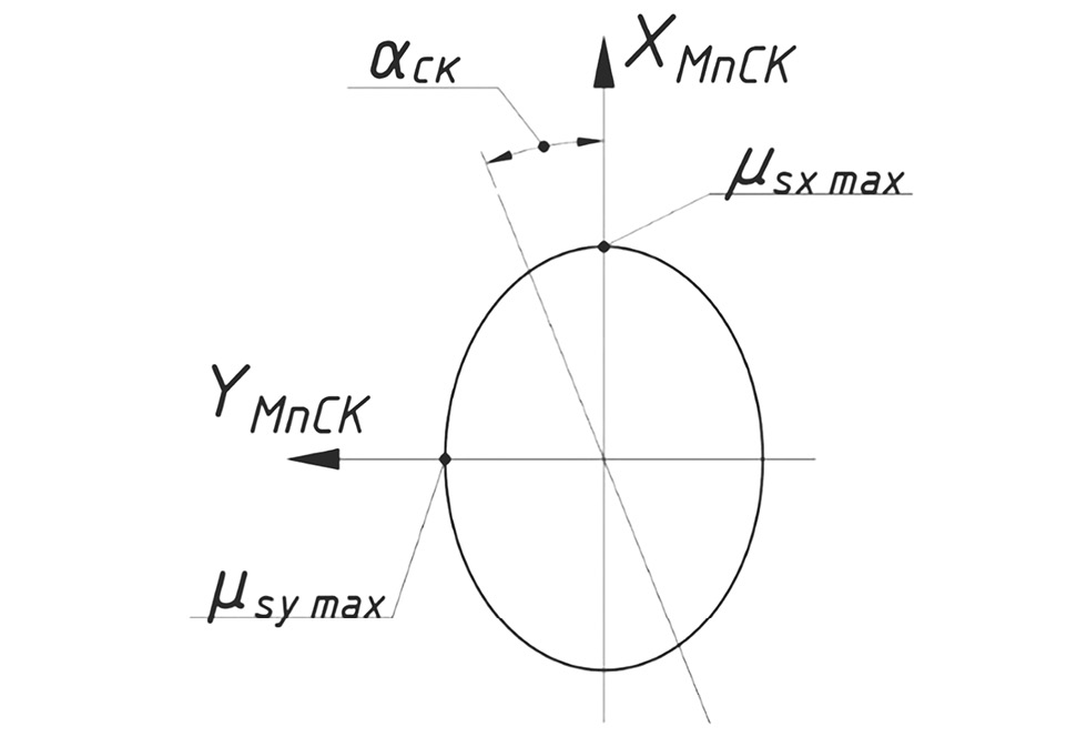 Предельная сила, в продольном и поперечном направлении, ограничена эллипсом трения. Так как предельная сила напрямую связана с коэффициентом трения предельного скольжения, тогда в качестве параметров эллипса будут приняты коэффициенты трения при полном буксовании на продольную ось XМпСК и поперечную ось YМпСК соответственно: µsx.max , µsv.max (рис. 6).