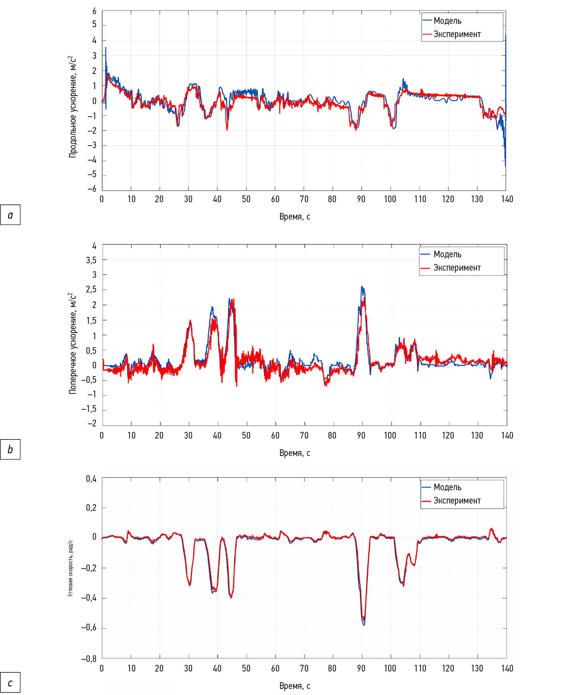 Рис. 12. Сравнение параметров движения автомобиля: а) — продольное ускорение, b) — поперечное ускорение, c) — угловая скорость.