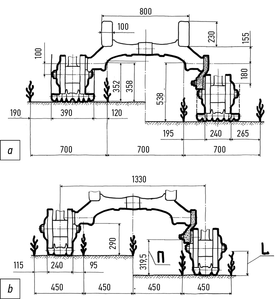 Fig. 4. The scheme of fit of the DT-75NP and DT-75DP tractors in row spacing of row crops: a — the 700 mm wide (corn, sunflower, potato, castor); b — the 450 mm wide (sugar beet, soy); on the left — without the clearance boosters; on the right — with the installed clearance boosters (darkened).