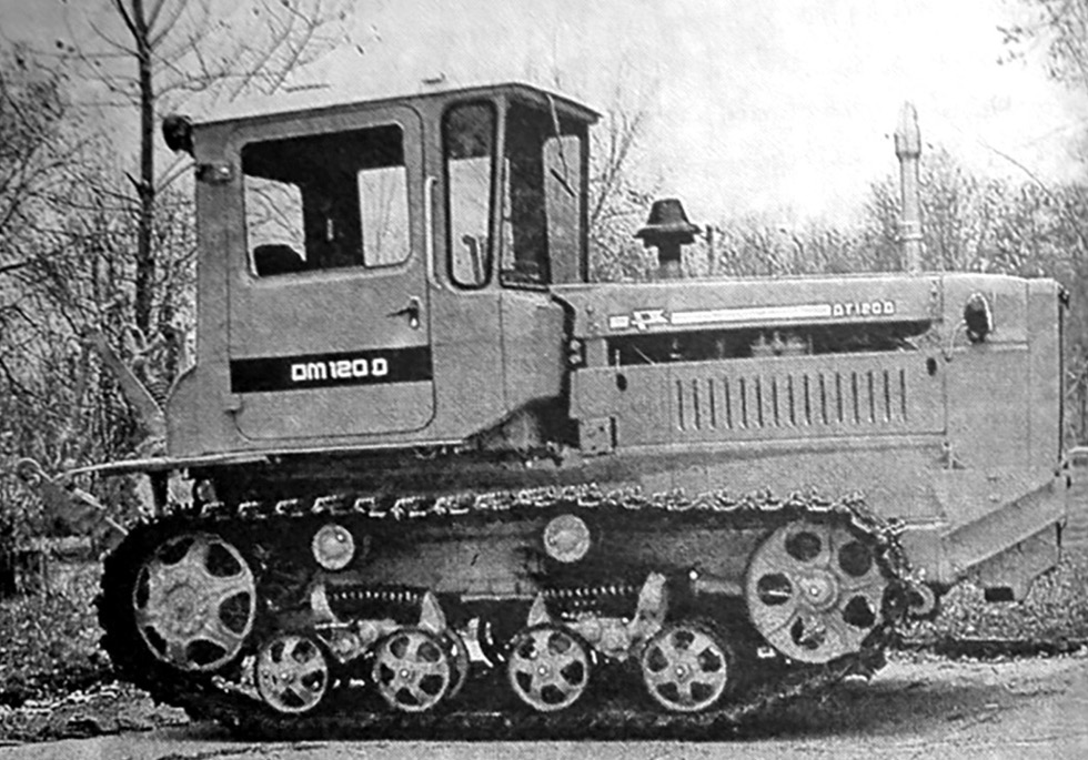 - К идее создания трактора средней между ДТ-75 и ДТ-175С мощности снова вернулись в 90-е годы, разработав трактор ДТ-120Д (рис. 15) с алтайским дизелем Д-442 с турбонаддувом и промежуточным охлаждением наддувочного воздуха, имевшим 2 уровня мощности: 88 кВт (120 л.с.) при 1800 мин-1 — для работы в тяговом режиме и 103 кВт (140 л.с.) — для работы с приводимыми от вала отбора мощности машинами. Запас крутящего момента дизеля на первом уровне мощности составлял 40%, что позволило сократить число рабочих передач до 5. Для обеспечения рационального положения центра масс трактор ДТ-120Д был снабжён передними секционными балластными грузами.