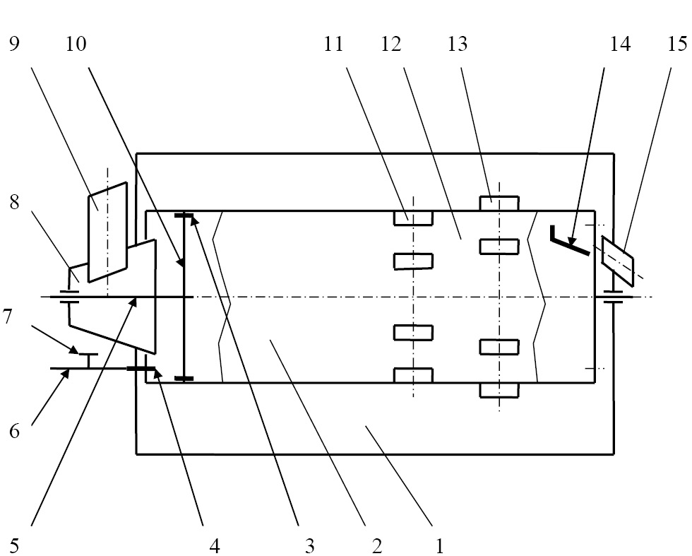 Figure 1 presents a general cross-sectional view of a drum technical device for washing root and tuber crops.