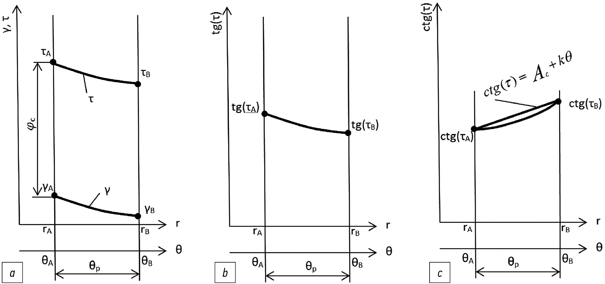 Fig. 2. Change of the angle τ and values of tg τ and ctg τ at the contact point of the blade with the soil in the phase of deepening the knife: a — changing the angles γ and τ; b — graph of the function tg τ; c — graph of the function ctg τ.