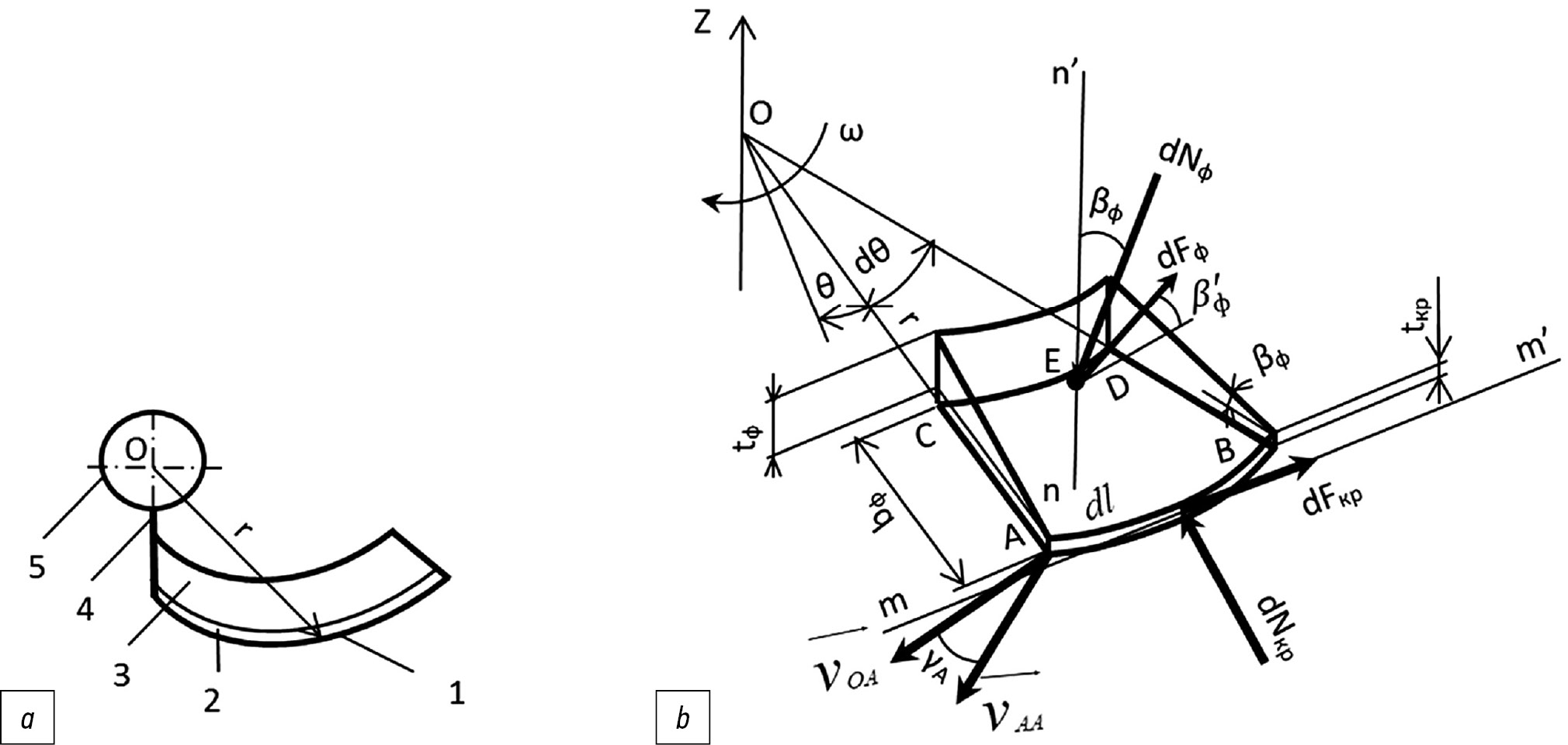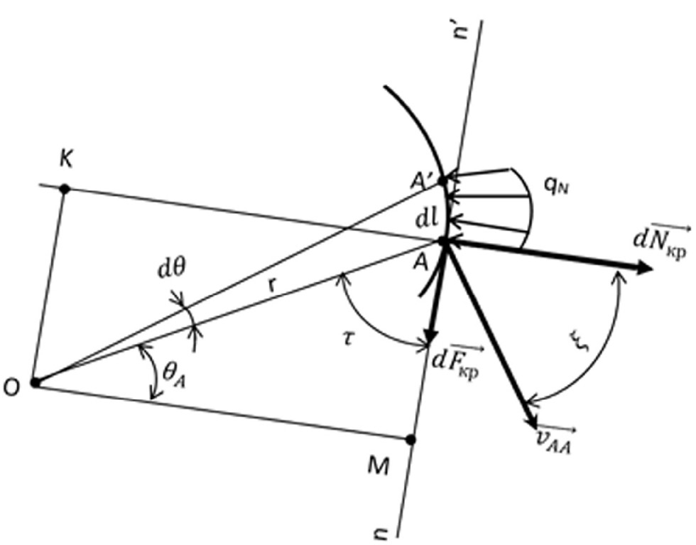 Пусть нож совершает вращательное движение вокруг точки О (рис. 1а) с угловой скоростью ω, а точка О перемещается со скоростью движения машины . Нож имеет лезвие АВ и ножку ОА, которая крепится к валу фрезы радиусом . Кромка АВ лезвия в полярной системе координат описывается выражением , где — радиус вектор; θ —угол поворота радиуса вектора. Начальное значение длины радиус-вектора |OA|=rA, конечное |OB|=rB. Лезвие AB ножа контактирует с частицей почвы или сорняка (далее объектом) в точке . Абсолютная скорость точки представляет собой сумму векторов окружной скорости и скорости . Вектор отклонён от вектора на угол . Проведя в точке касательную mm’ к лезвию отметим угол между ней и радиус-вектором .
