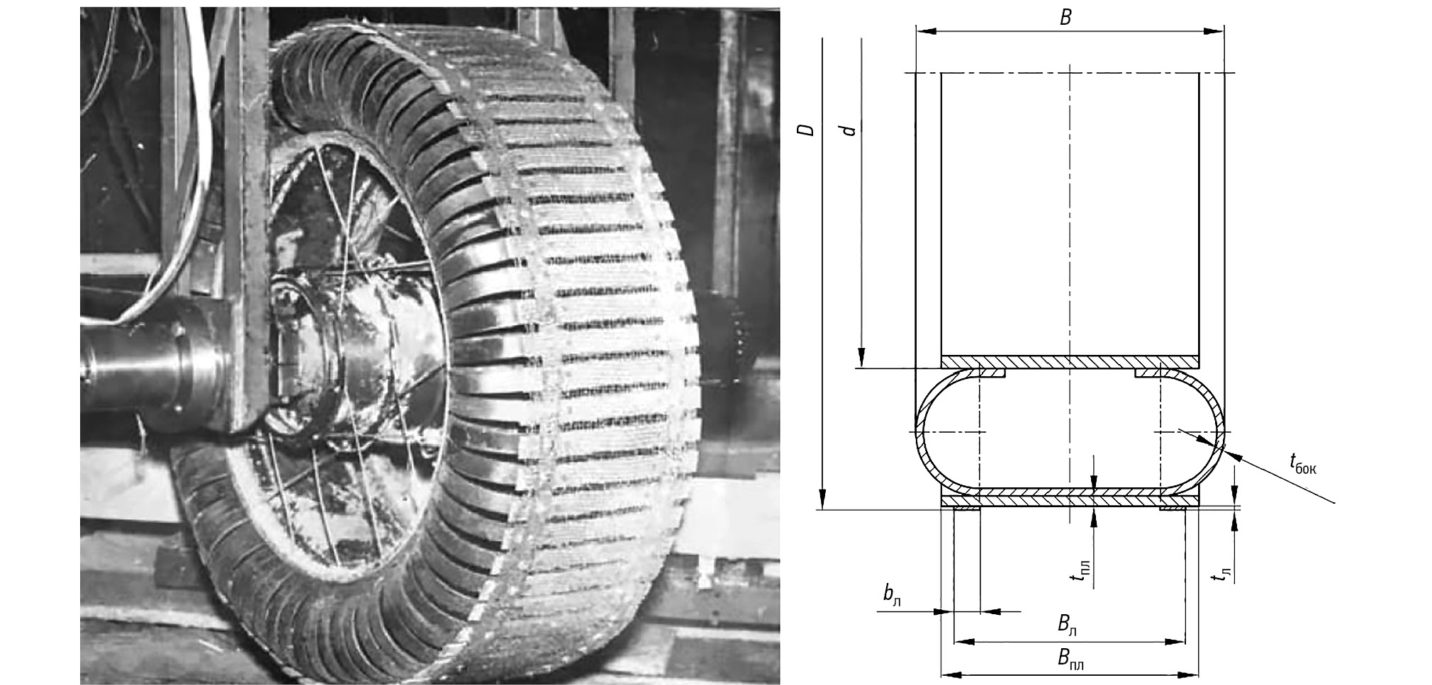 Для разработки математической модели МУК будем использовать образец колеса из работ Ю.Л. Рождественского и К.Ю. Машкова [4, 5]. На рис. 1 показан образец колеса с упругим каркасом из отдельных элементов, а также основные геометрические размеры, используемые в работе. Упругий каркас выполнен в виде упругих элементов, установленных по периметру внутреннего жёсткого обода радиально. Каждая упругая боковина соединена с жёсткой пластиной. В тангенциальном направлении пластины элементов связаны гибкими стальными лентами и вместе с покрытием из металлической сетки составляли цилиндрическую нерастяжимую беговую дорожку. При проведении натурных испытаний поверхность беговой дорожки (стеклотканевая оболочка и сетчатое покрытие) имело фрикционные качества, минимизирующие её скольжение по поверхностному слою грунта.