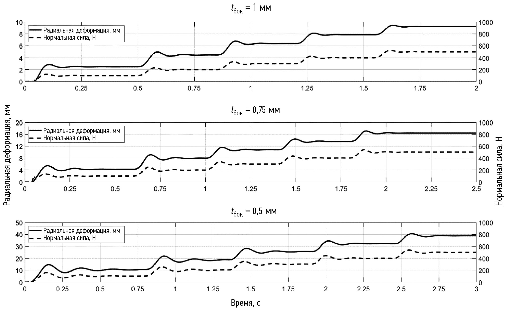Для построения нагрузочной характеристики МУК к оси колеса ступенчато с шагом изменения 100 Н (от 0 до 500 Н) прикладывается нормальная сила. На рис. 3 показаны зависимости радиальной деформации и нормальной силы от времени. Значение прогиба фиксировалось после окончания переходного процесса.