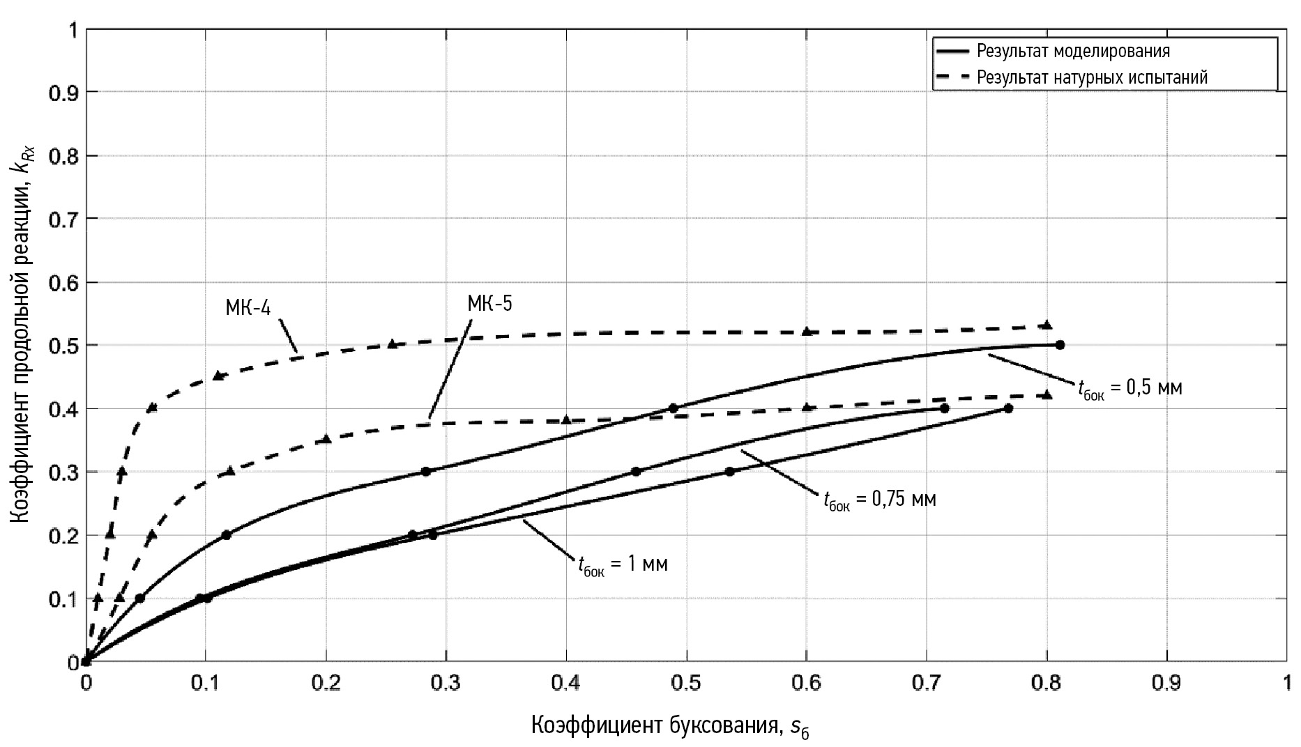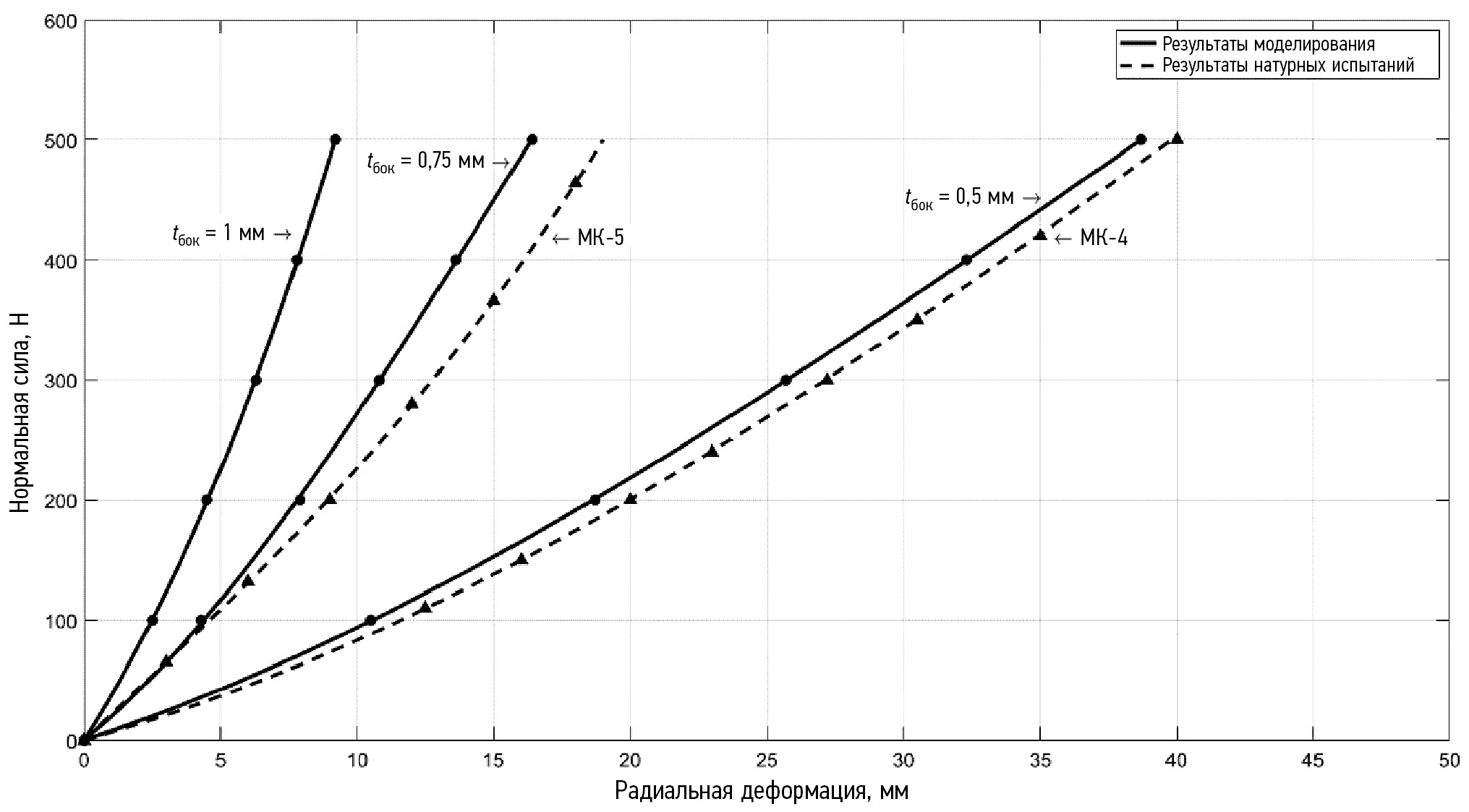 На рис. 4 представлены полученные в результате расчётов графики нагрузочной характеристики (зависимость нагрузки от радиальной деформации МУК) с различными значениями толщин боковин, а также результаты натурных испытаний, полученные в работах Ю.Л. Рождественского и К.Ю. Машкова [4, 5]. В указанных работах рассматривалась серия из пяти образцов МУК, отличающихся радиальной жёсткостью — МК-1, МК-2, МК-3, МК-4, МК-5. Образец МК-1 имел наименьшую жёсткость, образец МК-5 — наибольшую жёсткость. Радиальная жёсткость образца МК-5 близка к радиальной жёсткости смоделированного колеса с толщиной боковины мм; а для образца МК-4 — мм.