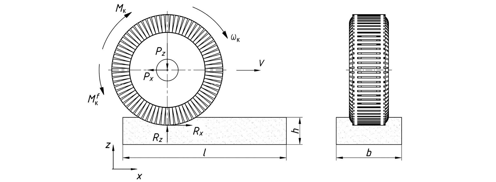 Расчётная схема качения колеса показана на рис. 5. При расчётах использовались следующие геометрические размеры грунтового канала: мм — длина грунтового канала, мм — ширина грунтового канала, мм — высота грунтового канала.