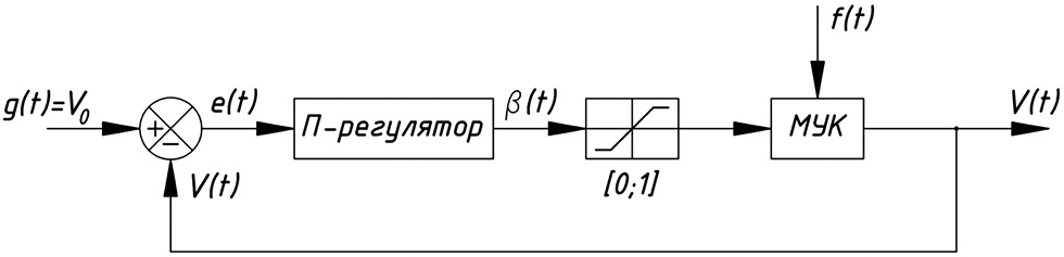 Блок-схема показана на рис. 6. Здесь мм/с — заданная линейная скорость; — ошибка по скорости; — управляющий сигнал, ограниченный от 0 до 1; — внешнее возмущение со стороны грунта. Так как в работе используется П-регулятор, то фактическая линейная скорость колеса будет меньше требуемой на некоторую постоянную величину (установившуюся ошибку).