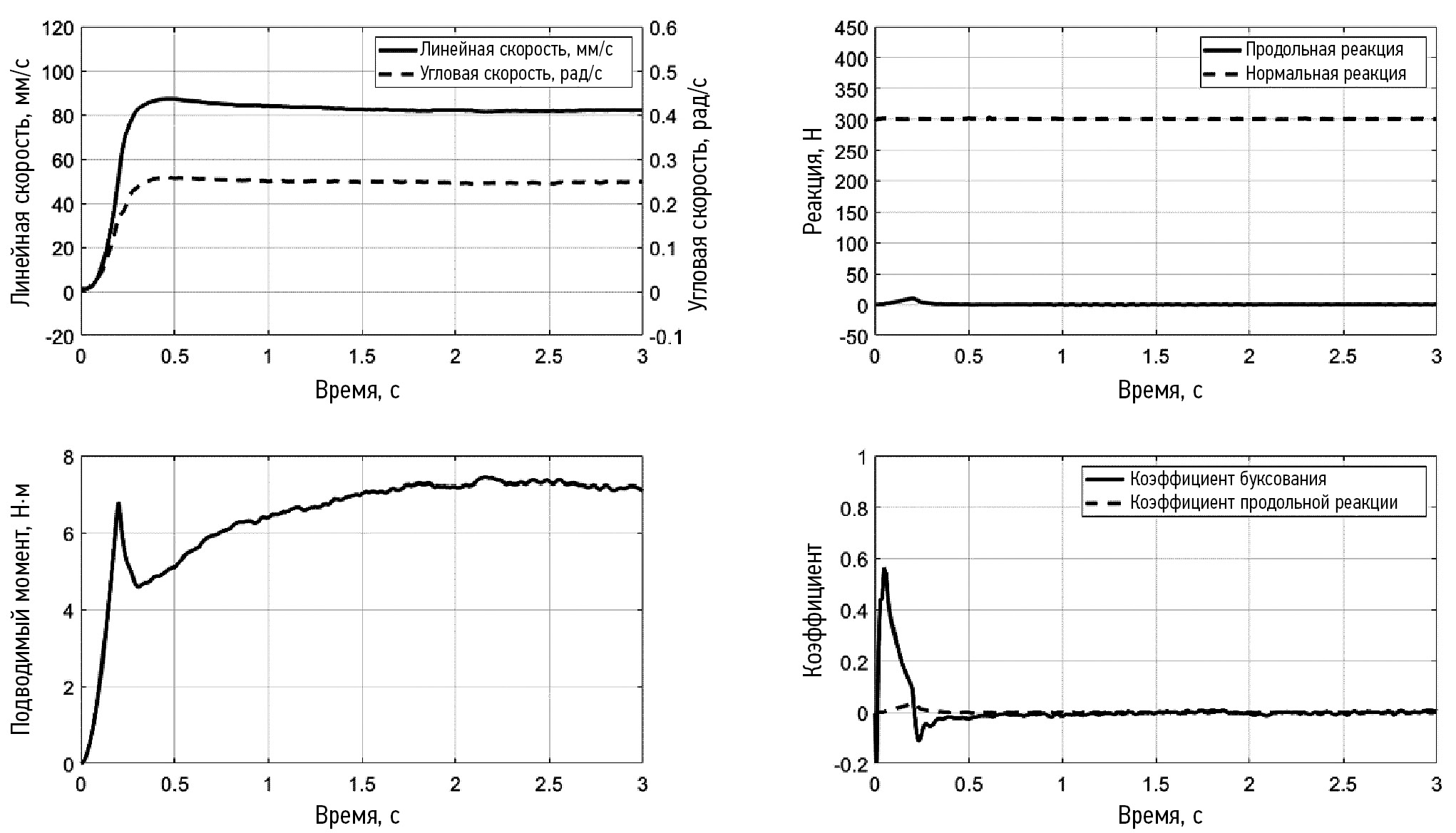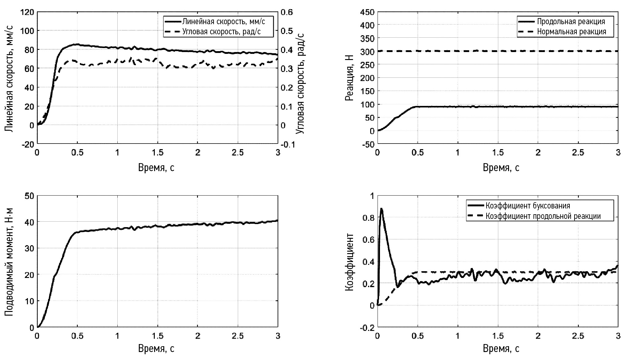 В процессе моделирования к колесу прикладывалась постоянная нормальная сила Н. Для определения тягово-сцепной характеристики колеса использовалось упрощённое управление подводимым к колесу моментом с пропорциональным регулятором (П-регулятором). Подводимый момент для облегчения подбора коэффициента П-регулятора определялся по формуле (2):