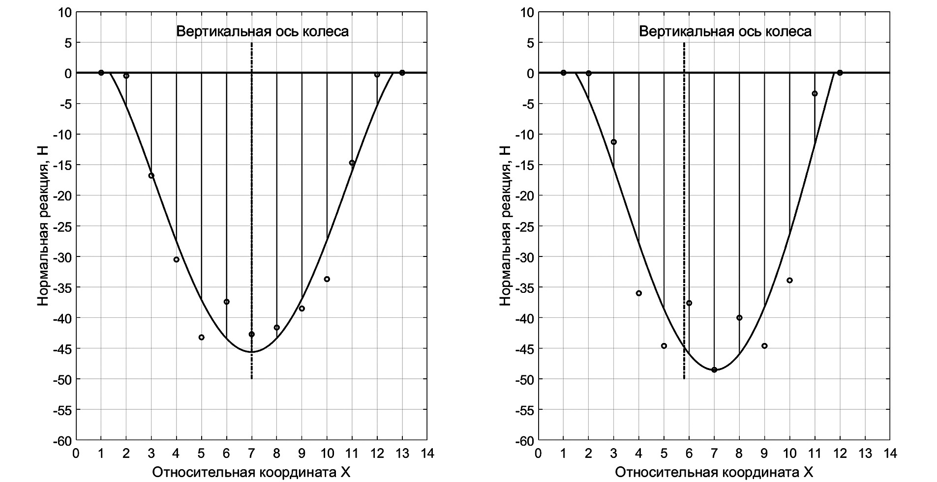 На рис. 11 показаны эпюры распределения нормальных реакций, когда колесо неподвижно и в ведущем режиме. Значения приведены для колеса с толщиной боковины мм. Для неподвижного колеса распределение реакций является симметричным, а в ведущем режиме суммарная реакция сдвигается по направлению движения на 36 мм, что соответствует результатам экспериментов [11–15].