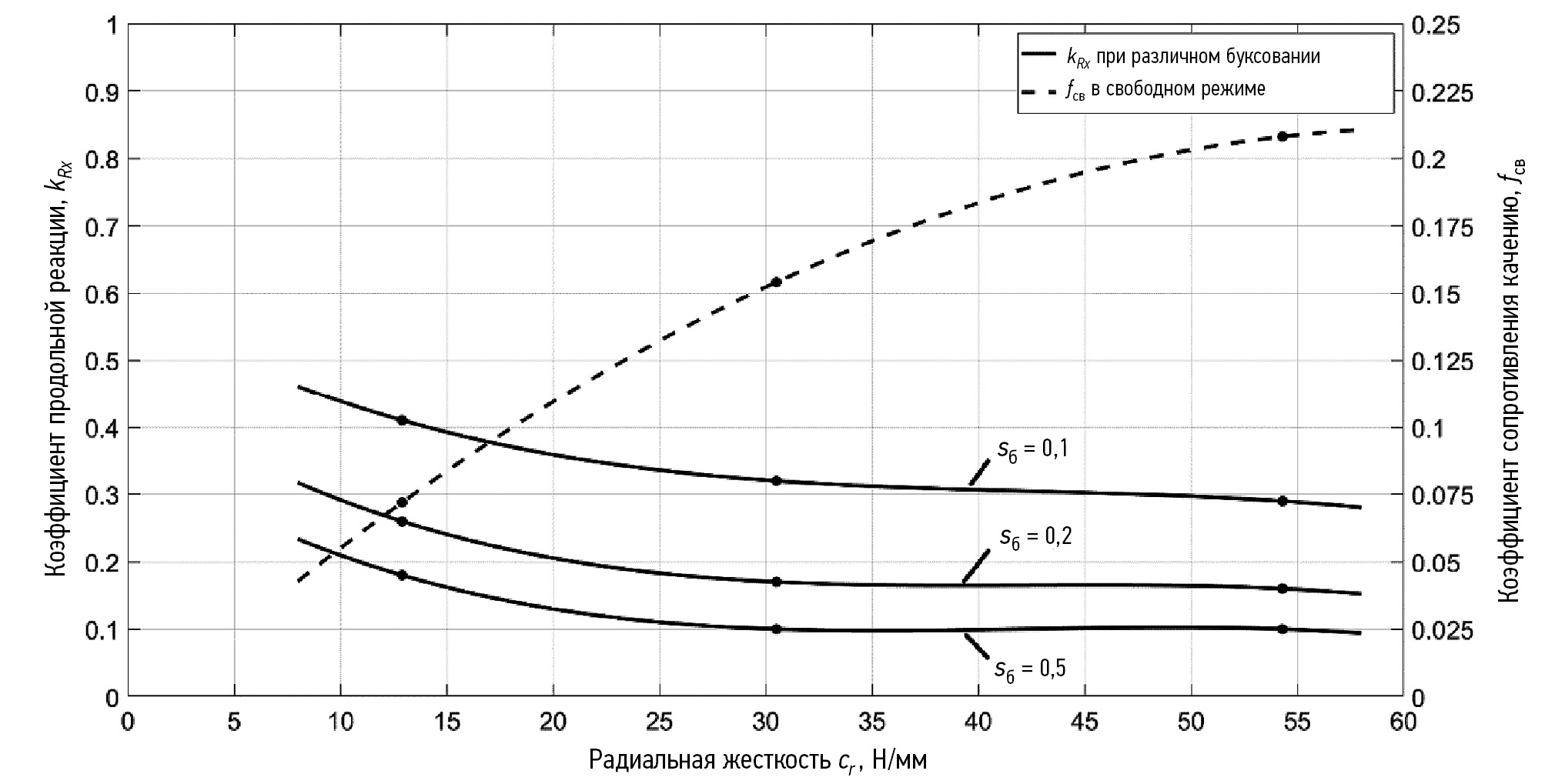 Показанные на рис. 10 зависимости коэффициента продольной реакции от коэффициента буксования позволяют качественно оценить влияние радиальной жёсткости МУК на тягово-сцепные свойства.