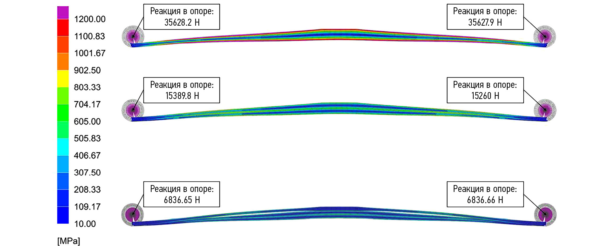 Рис. 5. Результаты расчётов рессор с помощью МКЭ.