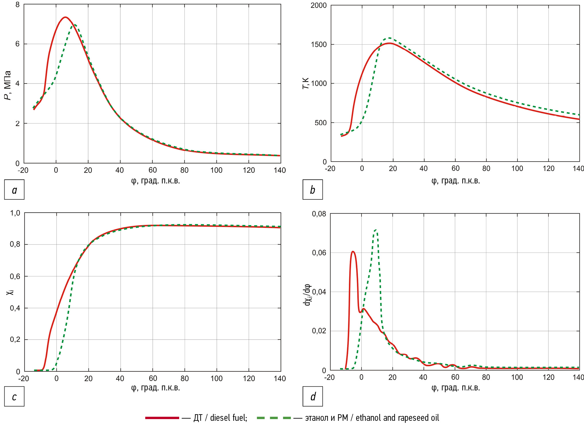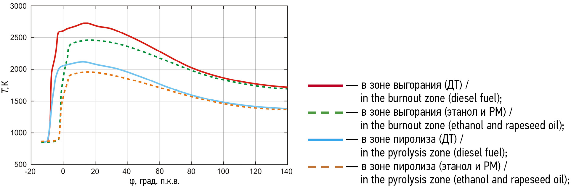 Период задержки воспламенения при работе тракторного дизеля на биотопливе увеличивался. Это происходит по трем основным причинам: пониженное цетановое число, падение скорости испарения запального топлива в КС вследствие ухудшения процесса смесеобразования, снижение температуры газов в цилиндре при испарении спирта. Этот эффект компенсируется высокой скоростью сгорания этанола и активным подводом тепла к рабочему телу после ВМТ. Поскольку цикловая подача этанола на номинальном режиме на 20% больше цикловой подачи ДТ и начало подачи этанола смещено на 4 градуса п.к.в. от ВМТ, то увеличивается объем факела этанола к моменту начала сгорания. Теплота сгорания этилового спирта и РМ ниже, чем ДТ. Это приводит к снижению расчетной температуры газов в зоне сгорания (рис. 3).