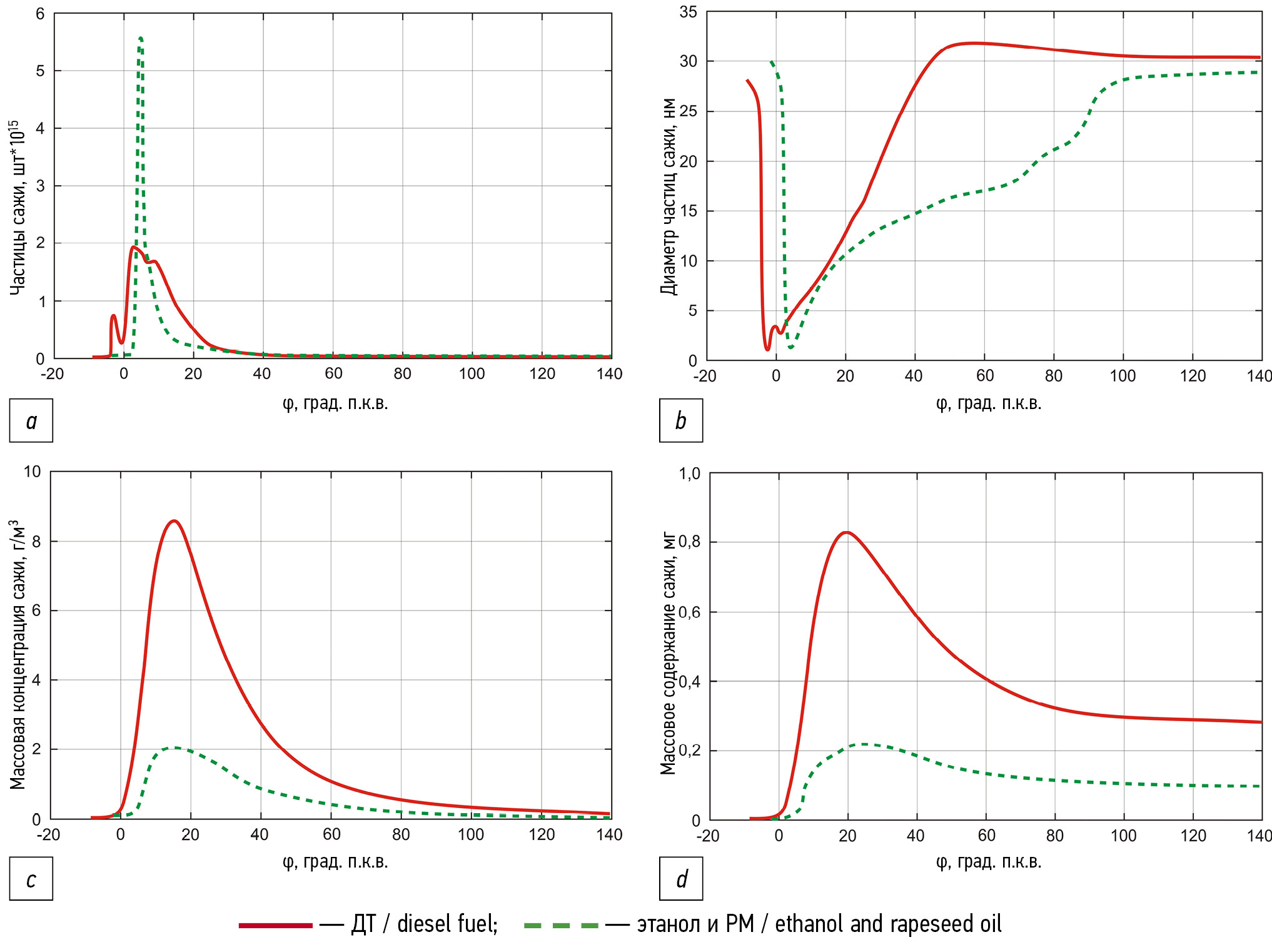 Максимальное количество частиц при работе дизеля на этаноле и РМ в 2,5 раза выше, чем при работе на ДТ. Это вызвано ростом периода задержки воспламенения и накопления большого количества углеводородов в реакционной зоне, а также низкой скоростью коагуляции частиц в реакционной зоне разложения этанола, что уже отмечалось выше. Перемещение экстремумов функций количества частиц и среднемассового диаметра на поздние углы п.к.в. вызвано смещением процесса сгорания.