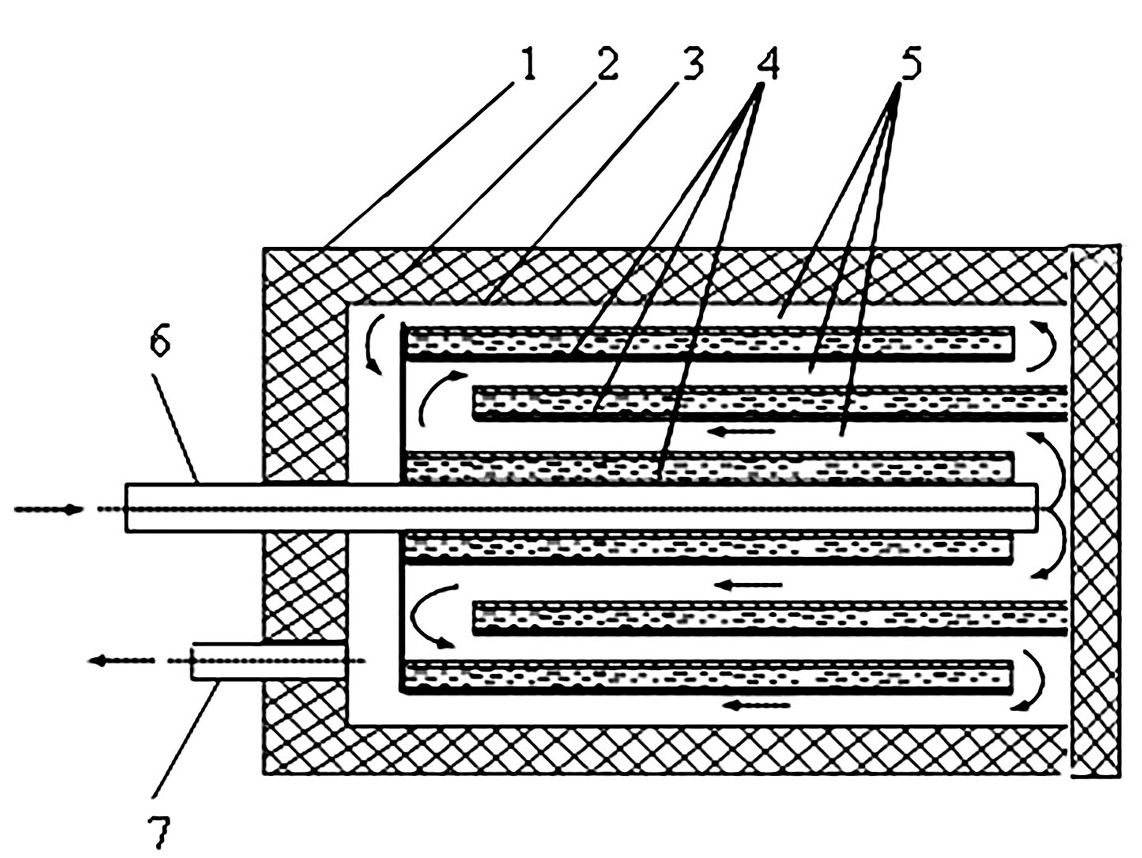 Рис. 1. Тепловой аккумулятор фазового перехода в продольном разрезе: 1 — наружный корпус; 2 — тепловая изоляция; 3 — внутренний корпус; 4 — металлические цилиндрические капсулы с теплоаккумулирующим материалом; 5 — щелевые зазоры теплоносителя; 6 — входной патрубок; 7 — выходной патрубок.