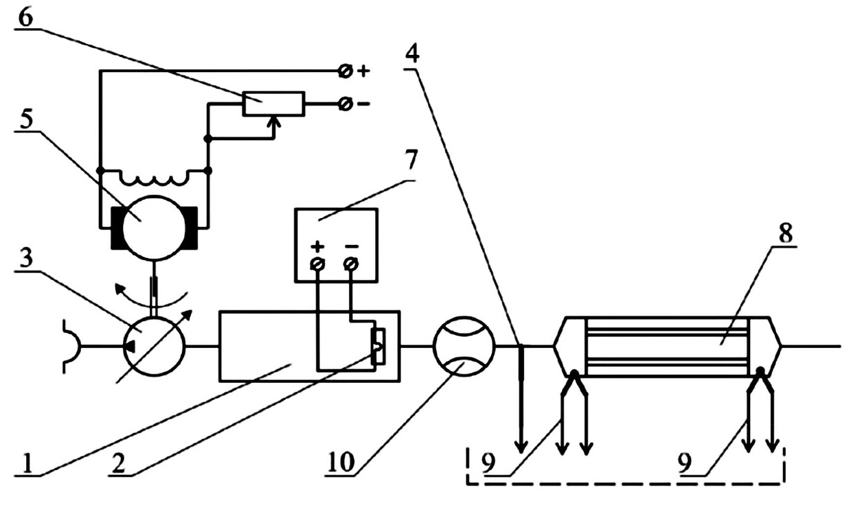 Fig. 2. Diagram of the experimental facility: 1 — an initial coolant temperature adjuster; 2 — a heating-cooling element; 3 — a supercharger; 4 — a thermal couple; 5 — an electric engine; 6 — a variable resistance element; 7 — an automatic control system of the heating-cooling element; 8 — a heat accumulator; 9 — thermal couples; 10 — the UGI Meters G4 gas flowmeter.