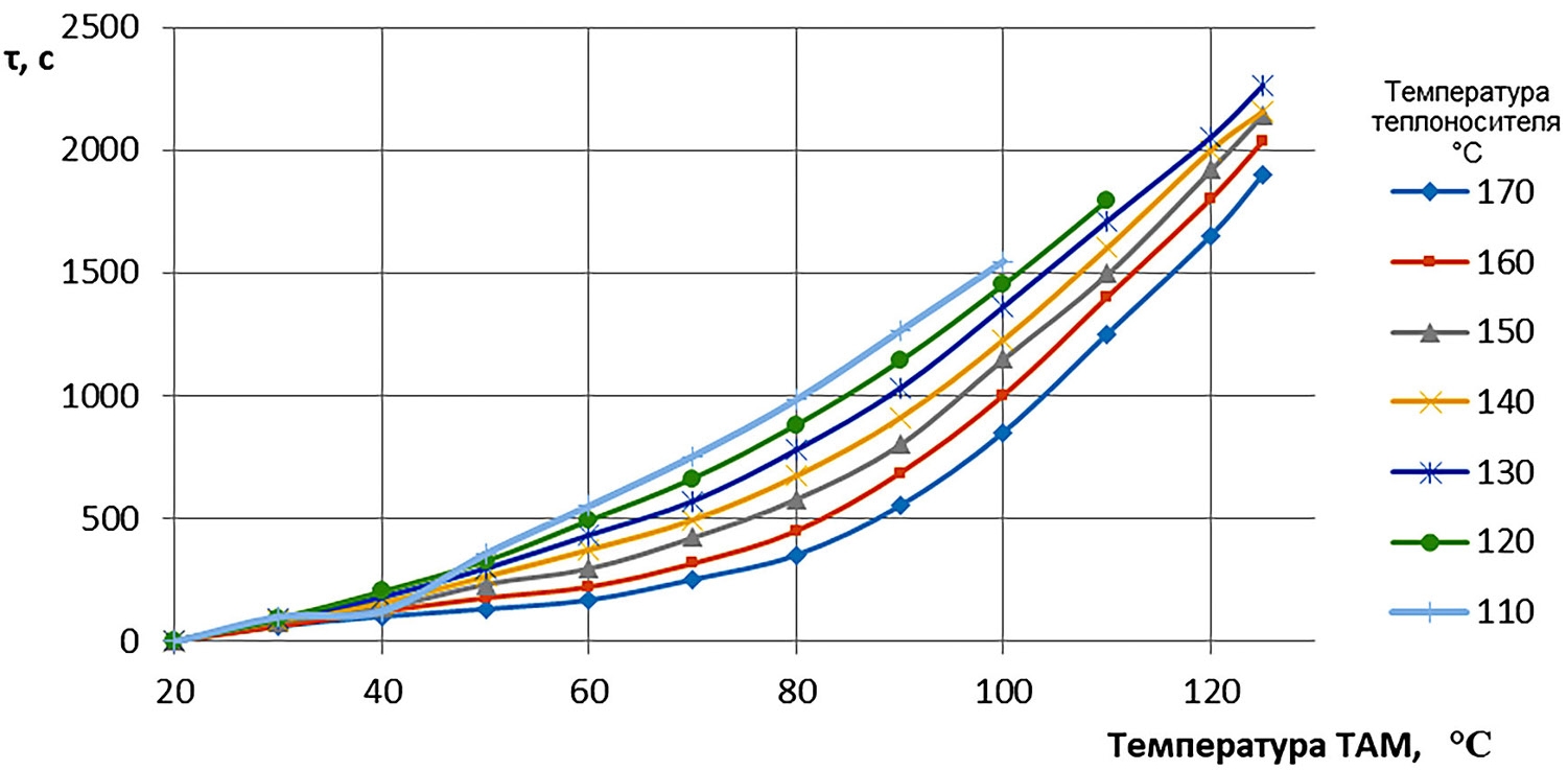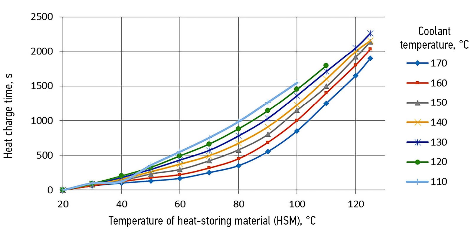 The dependence of heat-accumulator charging time on the heat-storing material temperature was constructed graphically at various initial temperatures of the coolant based on the values obtained. Figure 3 presents the dependencies.