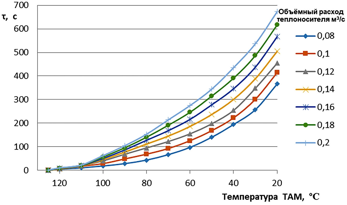Based on numerical values, we plotted the graphical dependences of the discharge period of the heat accumulator on the coolant temperature at different volumetric flow rates of the coolant (Fig. 4).