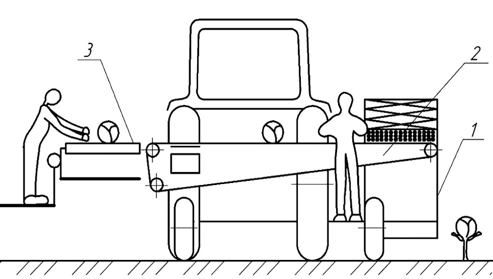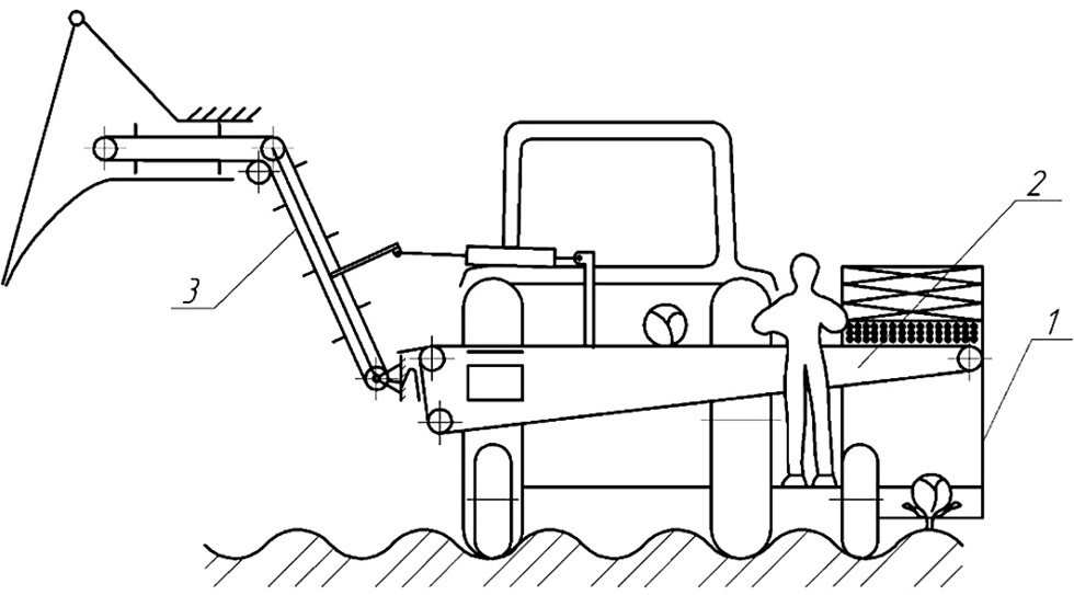 Fig. 3. Layout diagram of the multivariate cabbage harvester with a top-mounted longitudinal transporter: 1 — a cutting device; 2 — a conveyor-cutter; 3 — an upper longitudinal conveyor block.