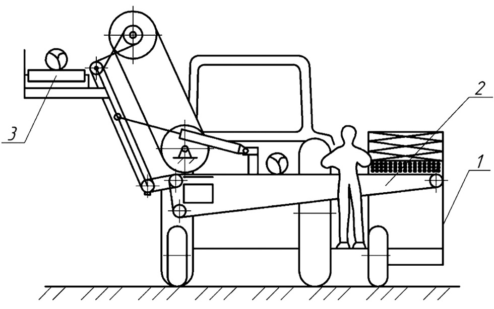 Fig. 1. Layout diagram of the multivariate cabbage harvester with an elevator: 1 — a cutting machine; 2 — a completion table with a conveyor-cutter; 3 — the elevator.