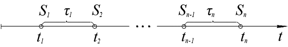 Рабочий процесс многовариантного капустоуборочного комбайна, на наш взгляд, можно рассматривать как функционирование некоторой физической системы, стояние которой меняется в ходе выполнения технологического процесса в ней с течением времени t в зависимости от ряда действующих стохастических факторов, т. е. система может находиться в дискретных состояниях в некоторые моменты времени через определенные интервалы (здесь ), как показано на рис. 4.
