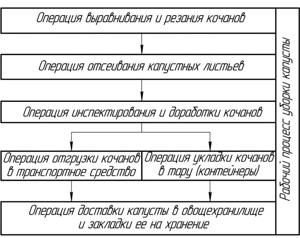 Для того, чтобы выяснить основные параметры, характеризующие эффективность функционирования рассматриваемой системы, представим процесс машинной многовариантной уборки кочанной капусты в виде совокупности последовательно выполняемых операций (рис. 5).