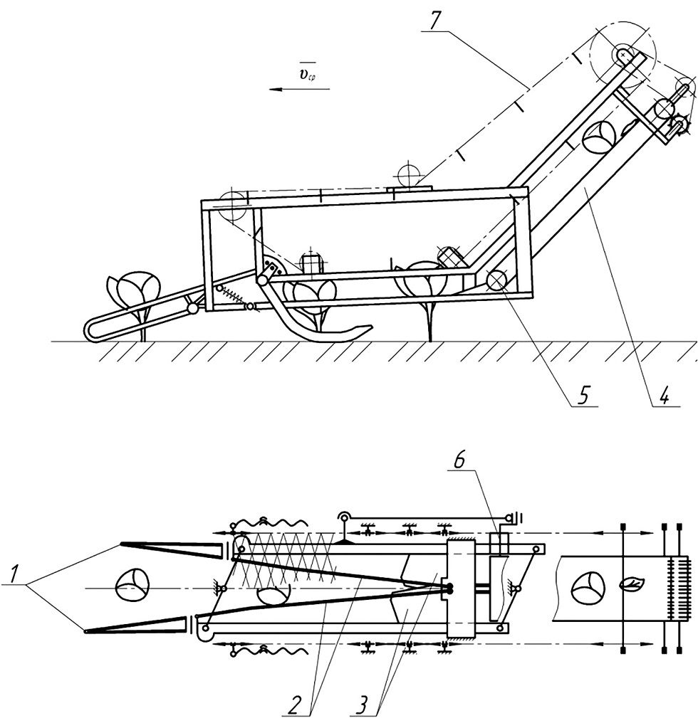 При этом лифтеры 1 и направляющие 2 выравнивают растения капусты и подводят к клиновидным колеблющимся ножам 3. Ножи при совместном действии выводят растения капусты в плоскость симметрии (в середину) режущего аппарата и срезают кочаны вместе с розеточными листьями [5].