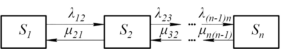 Предельные вероятности состояний физической системы можно вычислить, составив на основании графа состояний системы, представленной на рис. 7, систему дифференциальных уравнений вида [6]: