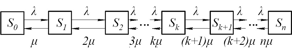 Здесь каждое состояние физической системы обведено прямоугольниками, а ее возможные переходы из состояния в состояние изображены стрелками, соединяющими эти прямоугольники. У каждой стрелки проставлена интенсивность протекания стохастического события, в частности, по стрелкам вправо — , а по стрелкам влево — .